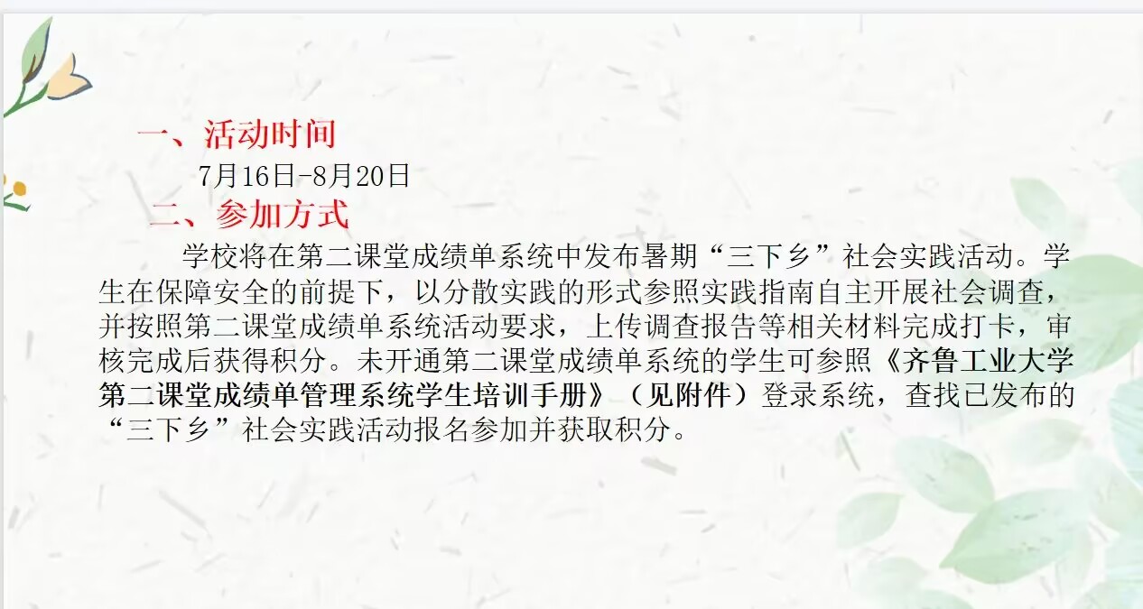 此次线上动员大会,强调了分散实践队出行要求、安全管理规定、总结提交要求等信息,充分调动了学生深入基层开展社会实践的积极性,为暑期“三下乡”分散社会实践活动打下了坚实的基础。读万卷书,行万里路,本次实践活动不仅可以展现青年大学生的良好精神风貌,更有利于进一步巩固实践育人的实效。