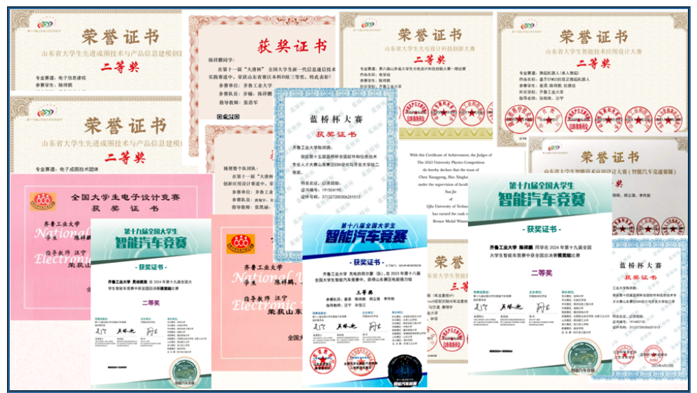 陈祥鹏,男,中共党员,电子信息工程2021级学生,曾任校智能电子协会组织委员,获得2023-2024年国家奖学金、2022年度山东省优秀学生。在学习上,刻苦拼搏,成绩位列专业前茅,连续三年获得”一等学习成绩优秀奖学金”、“三好学生标兵”。在竞赛方面,积极参与专业相关学科竞赛,将理论知识与实际相结合,获得国家级奖项3项、省级奖项10余项、受理专利2项和大学生创新创业训练计划项目1项。在志愿实践方面,作为学部“电照风行”志愿服务团队一员,志愿队进行多次科普支教活动,活动多次被《齐鲁壹点》等省级媒体所报道。